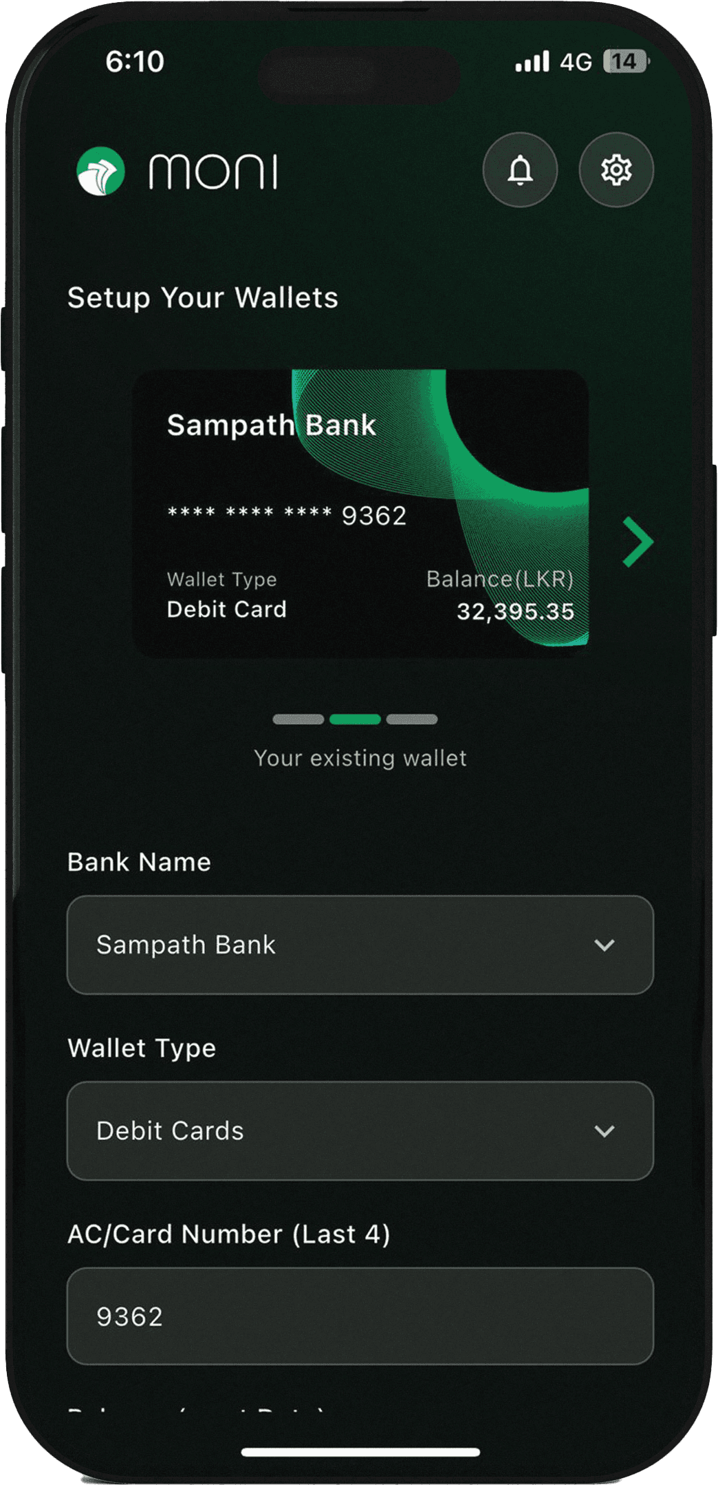 Sync your bank accounts and cards securely to let Moni track your finances automatically — no manual entries needed.